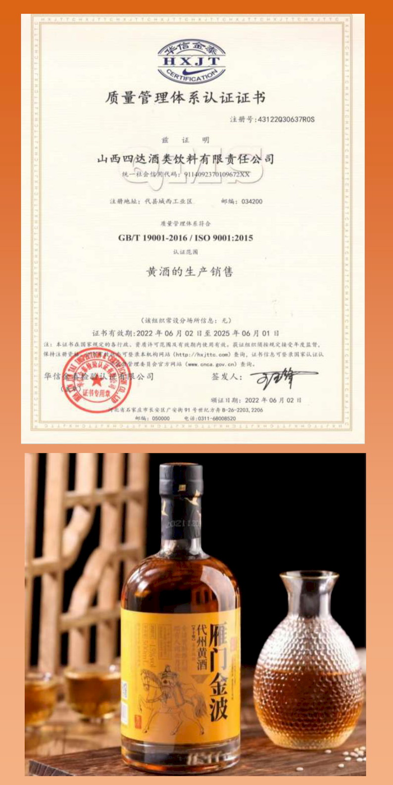 | 山西四达酒类饮料有限责任公司是一家传承并生产北方黄酒的民营企业,2000年由原国营山西省代县酒厂(1969)改制而来,年产能力为4000吨黄酒的规模。公司的理念是“守正传承创新发展”。 2011年6月代县黄酒酿造技术成功入选山西省非物质文化遗产保护名录。山西省人民政府认定的“代县黄酒酿造技艺”非物质文化遗产项目省级保护单位、先后被评为“山西省农业产业化省级重点龙头企业”、“山西省高新技术企业”,2023年获“全省农业农村领域五小创新大赛优秀成果一等奖”;忻州市委、市政府“五一劳动奖状”。2024年荣记山西省农林水系统“集体二等功一次”。 公司有雁门金波、四达、宋丑子等品牌,其中“四达牌”商标被认定为山西省著名商标。 | |||||