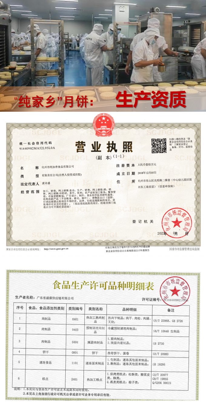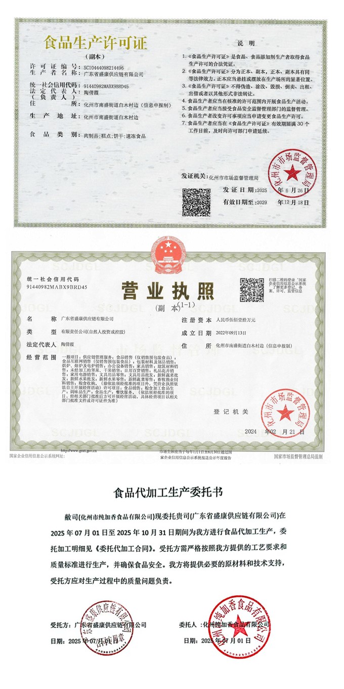 本产品由广东化州市纯加香食品有限公司委托广东省盛康供应链有限公司进行生产。 广东化州市纯加香食品有限公司位于化州市东山区光明路二横巷,成立于2018年12月,经营范围包括加工、销售、网上销售食品; 广东省盛康供应链有限公司成立于2022年9月,地位于化州市南盛街道白木村边,具有食品生产许可。 |