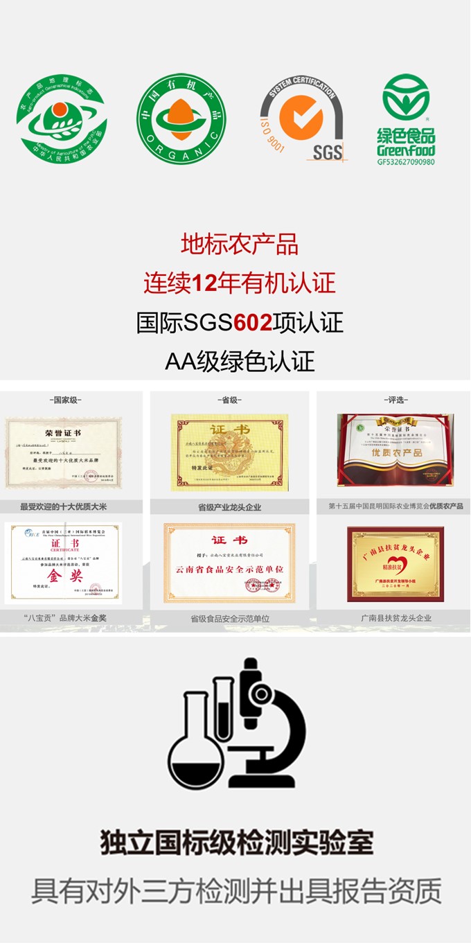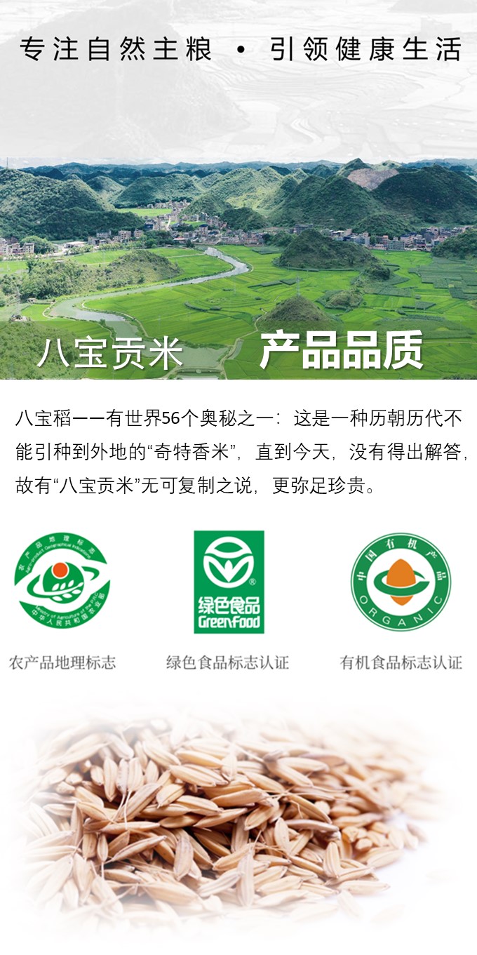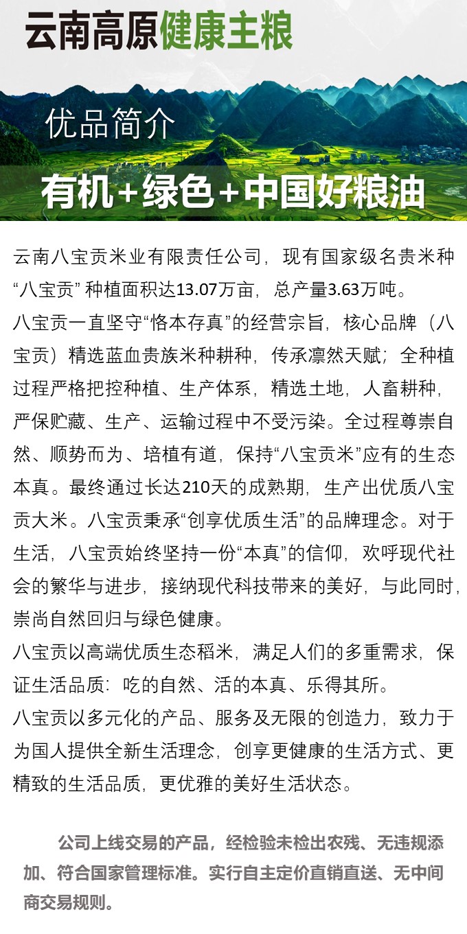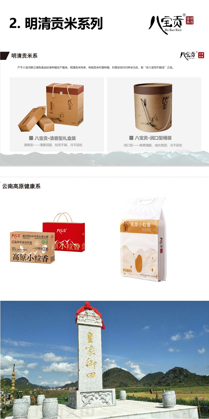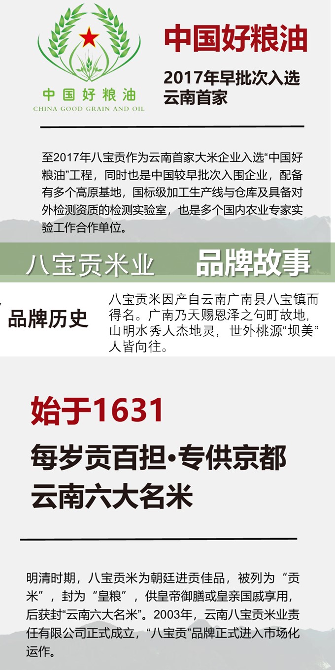 | 云南八宝贡米业有限责任公司是一家专门从事大米生产、加工、储运、销售的省级农业产业化重点龙头企业,于2003年成立于“中国八宝米之乡”的广南,现为云南八宝贡集团旗下全资子公司。 八宝贡先后通过SC、有机食品和绿色食品认证,获得云南省“放心粮油”,“云南省名牌农产 品”等荣誉称号。八宝贡米业目前拥有三个大米品牌:八宝贡、滇南里和高原八宝香。 | |||||