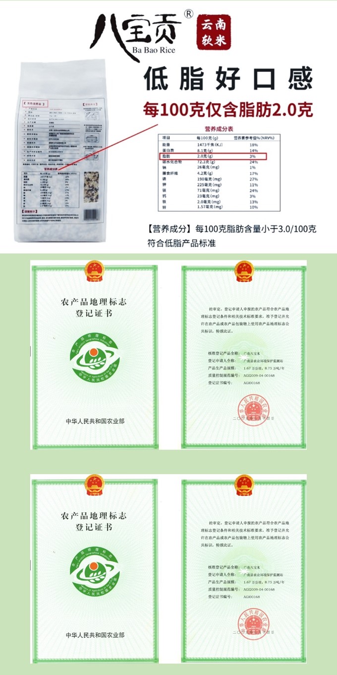 | 八宝贡 高原小粒香 软糯香米 云南高原健康主粮 10kg | 八宝贡 | 云南省文山州广南县 | 云南八宝贡米业有限责任公司 | ||